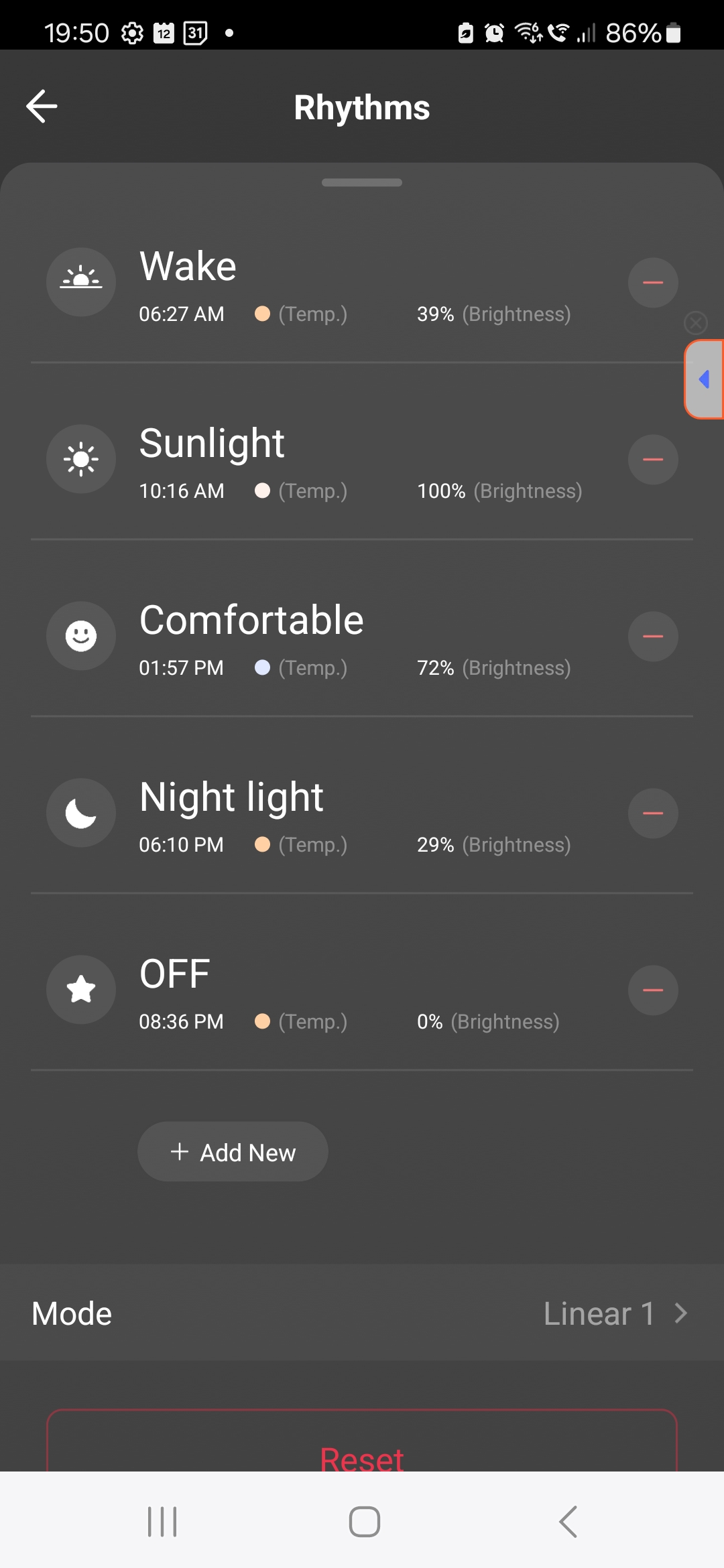 Nejnovější typy chytrých svítidel možnost plně automatizovaného cirkadiánního osvětlení umožňují nastavení přímo v menu: