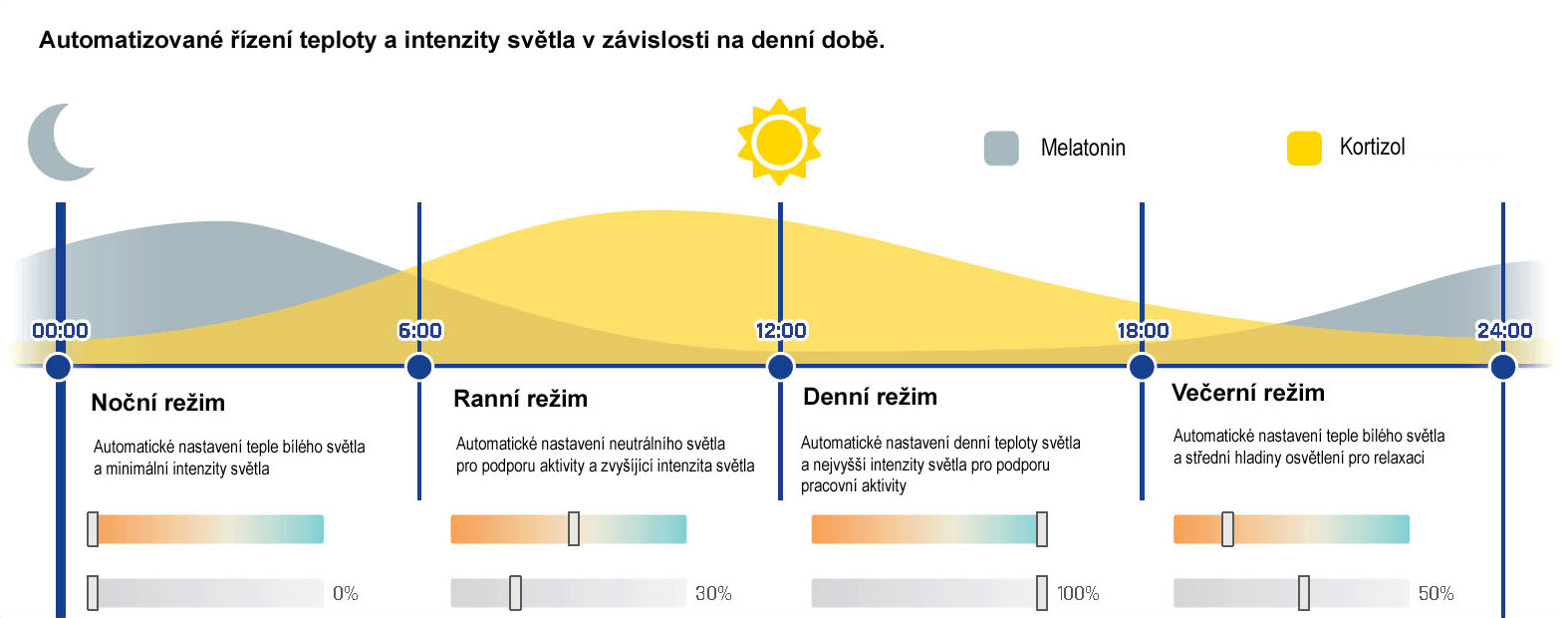 Cirkadiánní osvětlení tedy napodobuje tyto přirozené změny světla v průběhu dne: