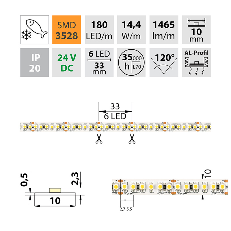 LED pásek na PEČIVO 14,4W/m, 1465lm/m, 24V - LED pásek pro osvětlení pečiva, 14,4W/m, 1465lm/m, 24V, rozteč LED 5,5mm, 180LED/m, rozměry w=10mm, l=5000mm, dělení po 6LED/33,3mm, cena za 1m