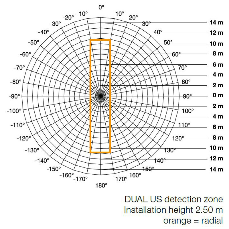 | Výhodné vlastnosti | Záběr čidla je vhodný pro pokrytí dlouhých chodeb a pod. Čidlo lze parametrizovat dálkovým ovladačem, který není součástí dodávky. |