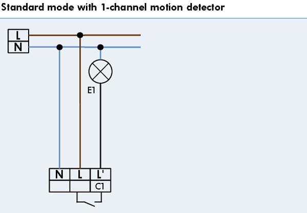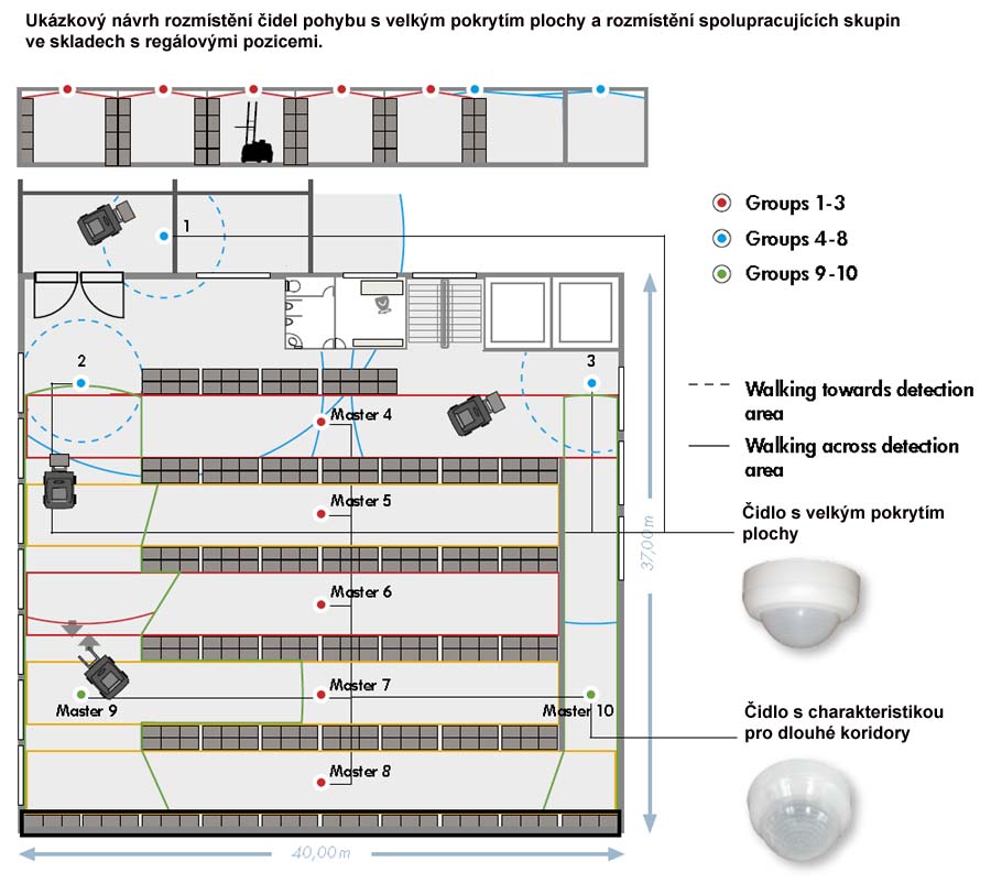 | V místnostech větších rozměrů, nebo chodbách lze činnost čidel synchronizovat zapojením čidel systémem MASTER / SLAVE. | |