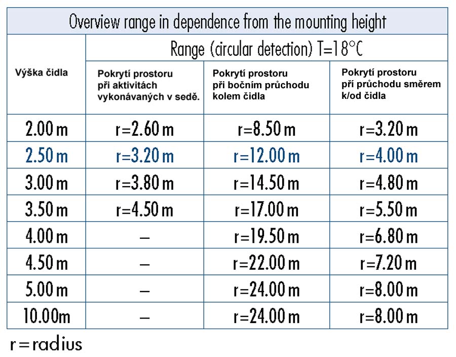 | Pásma citlivosti čidel (platí pro výšku čidla 2,5m při teplotě okolí 18°C) | Pásmo ciltivosti při boční míjení čidla d=40m, pásmo citlivosti ve směru k/od čidla d=20m. |