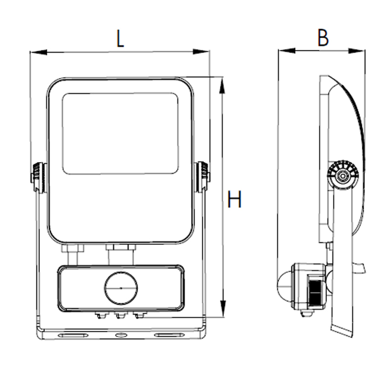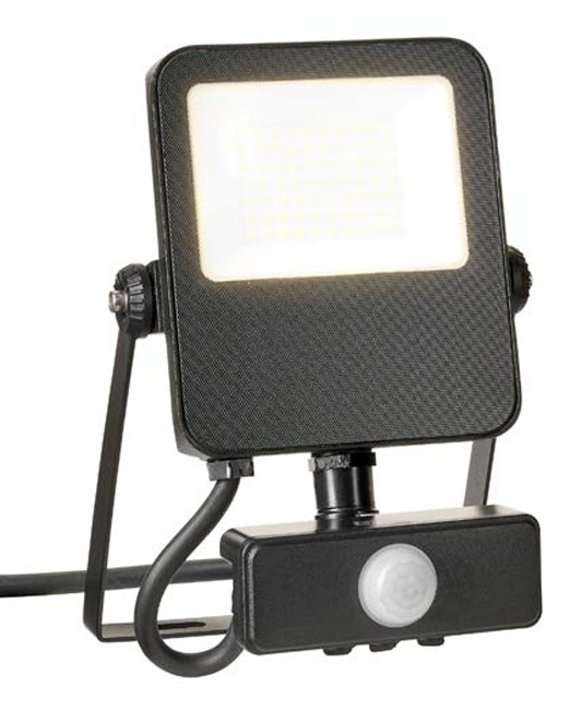 LED reflektor se senzorem pohybu PIR, nastav. směr svícení, základna hliník, povrch černá, difuzor sklo opál, LED 30W/3300lm, 50W/5500lm, teplá 3000K/neutrální 4000K, Ra80, 230V, IP65, tř.1. rozměry dle typu.
