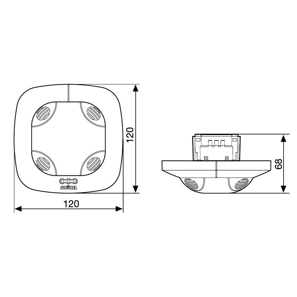 PIR a US - kvalitní stropní vestavný detektor přítomnosti, záběr 360°/180°, dosah až 10m, čas sepnutí 30s-30min, nast soumraku 10-1000lx, montážní výška 2,5-3,5m, max.2000W, teplotní rozmezí -25/+55°C, 230V, IP20, 120x120x68mm