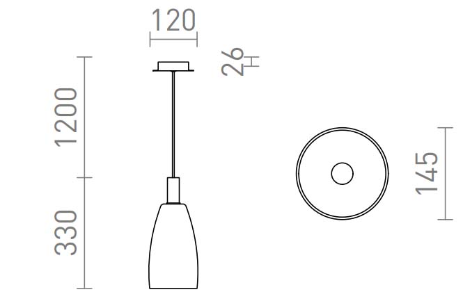 | Rozměry | d=145mm, h=330mm, vč závěs lanka h=1200mm, lze zkrátit. Uváděné rozměry jsou pouze informativní a výrobce je může změnit. |