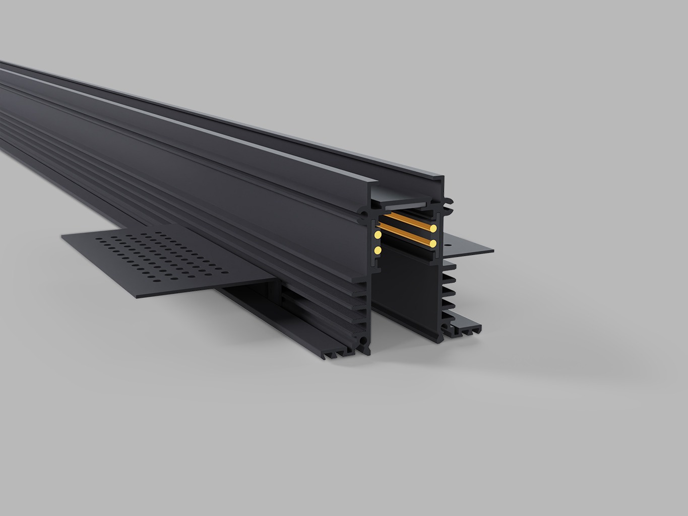 | Použití | Vestavná montážní základna je potřebná jak pro stropní přisazenou, tak závěsnou montáž. Základna se přišroubuje ke stropu, nebo se na ní zakončí závěsná lanka a na tuto lištu se připevní vlastní napájecí magnetická lišta |