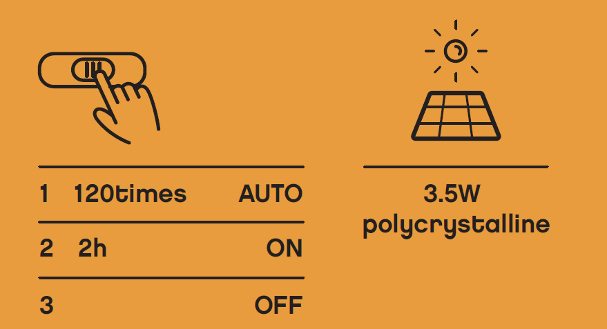 | Režim se senzorem pohybu | Svítidlo se po soumraku, po zaznamenání pohybu rozsvítí svítidlo na dobu 30s. Baterie má kapacitu na 120 sepnutí osvětlení senzorem do dalšího nabití |
