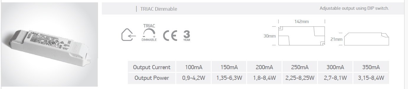 LED zdroj I TRIAC 100mA-350mA, 8W - Napájecí zdroj pro LED, vstup 230V, nast. výstup podle přepnačů 100mA/150mA/200mA/250mA/300mA/350mA, 8W, stmívání TRIAC, IP20, rozměry 142x21x30mm.