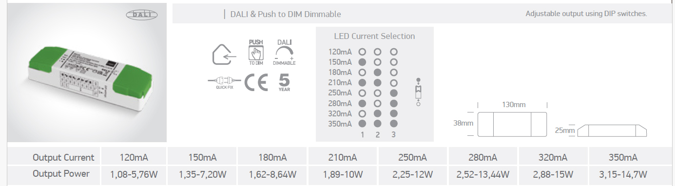 LED zdroj II DALI-PUSH 120mA-350mA, 14W - Napájecí zdroj pro LED, vstup 230V, nast. výstup podle přepnačů 120mA/150mA/180mA/210mA/250mA/280mA/320mA/350mA, 14W, stmívání DALI/PUSH, IP20, rozměry 130x25x38mm.