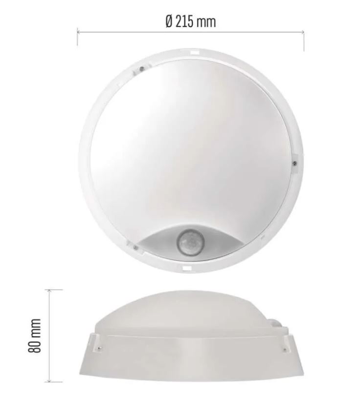 Přisazené venkovní svítidlo, PIR senzor pohybu, záběr 120°, dosah 10m, těleso plast bílá, rámeček bílá a černá, difuzor plast opál, LED 14W, 1000lm, teplá 3000K/neutrální 4000K, Ra80, 230V, IP54, rozměry d=215mm, h=80mm.