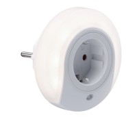 Noční, orientační svítidlo se zásuvkou, soumrakový senzor večer rozsvítí/ráno zhasne, těleso plast, bílá, difuzor plast opál, LED 0,2W, teplá 3000K, do zásuvky 230V, IP20, tř.2, rozměry d=90mm, h=70mm.