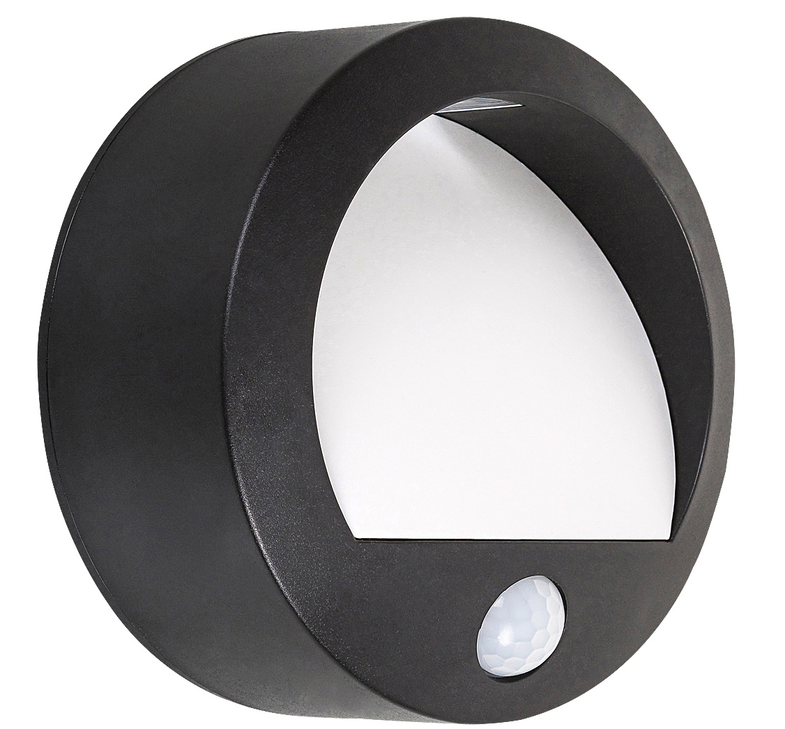 Nástěnné venkovní svítidlo, senzor pohybu záběr 90°, dosah 8m, plast, vnější černá, nebo bílá, vnitřní bílá, LED 1,5W, 50lm, teplá 3000K, napájení 3x1,5V baterie AA , IP44, rozměry d=110mm, h=56mm, svítí dolů