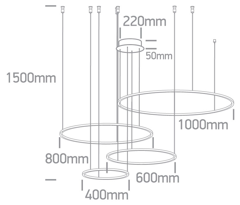 | Rozměry | d=400+600+800+1000mm, vč. závěsného kabelu l=1500mm, lze zkrátit. Uváděné rozměry jsou pouze informativní a výrobce je může změnit. |