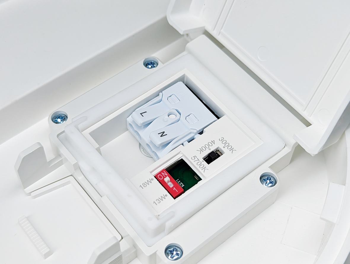 Výhodné vlastnosti | CCT pomocí přepínače uvnitř svítidla, lze přepínat výkon světla a teplotu světla teplá 3000K neutrální 4000K, denní 5700K. Tímto lze bez úpravy elektroinstalace přepnout teplotu světla. |