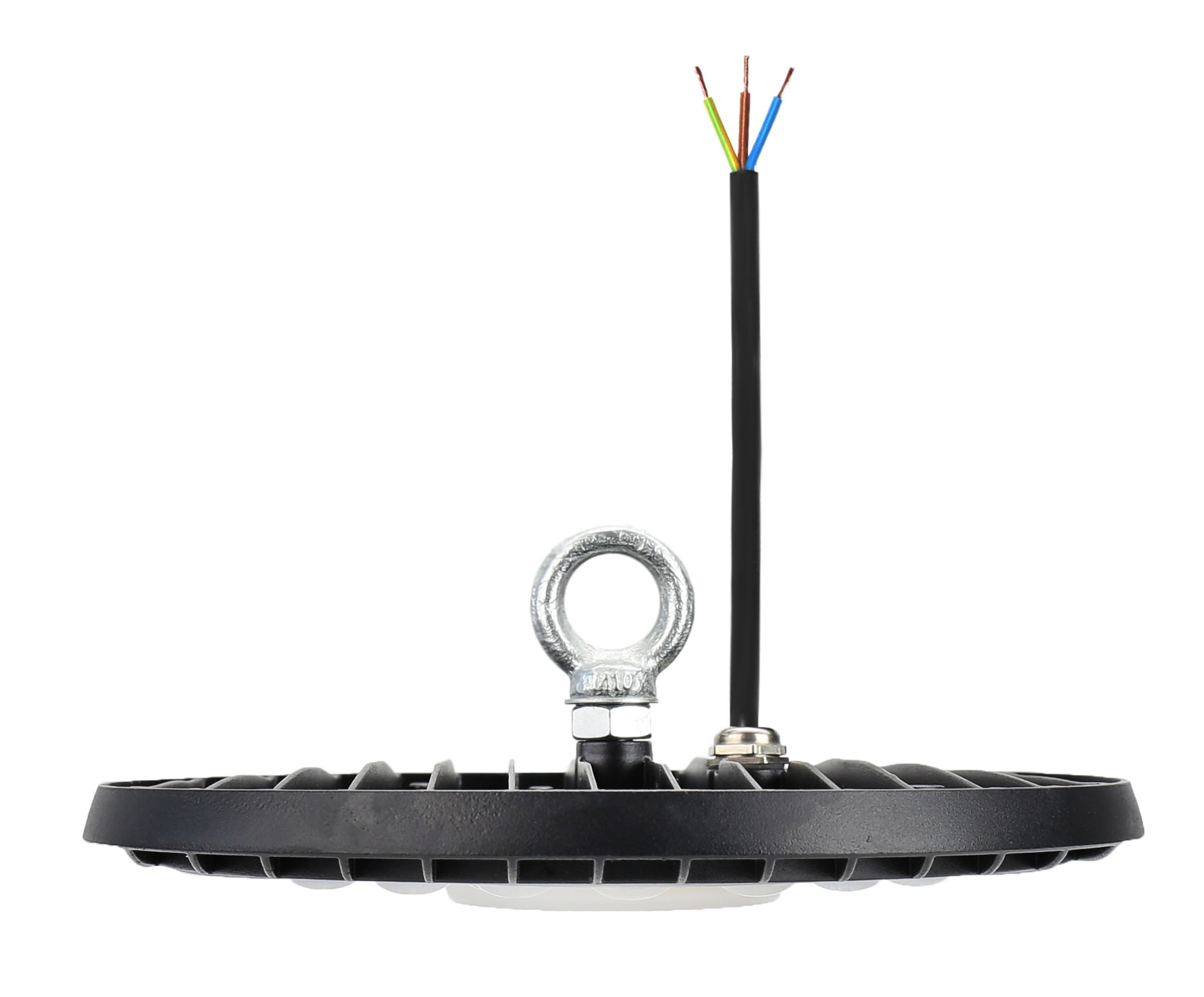 UFOLIGHT 105W, IP65 - Závěsné průmyslové svítidlo, těleso kov, povrch černá, krycí plast čirý, LED 105W, 11550lm, neutrální 4000K, vyzař. úhel 70°, Ra80, 230V, IP65, IK06, rozměry d=218, h=80mm