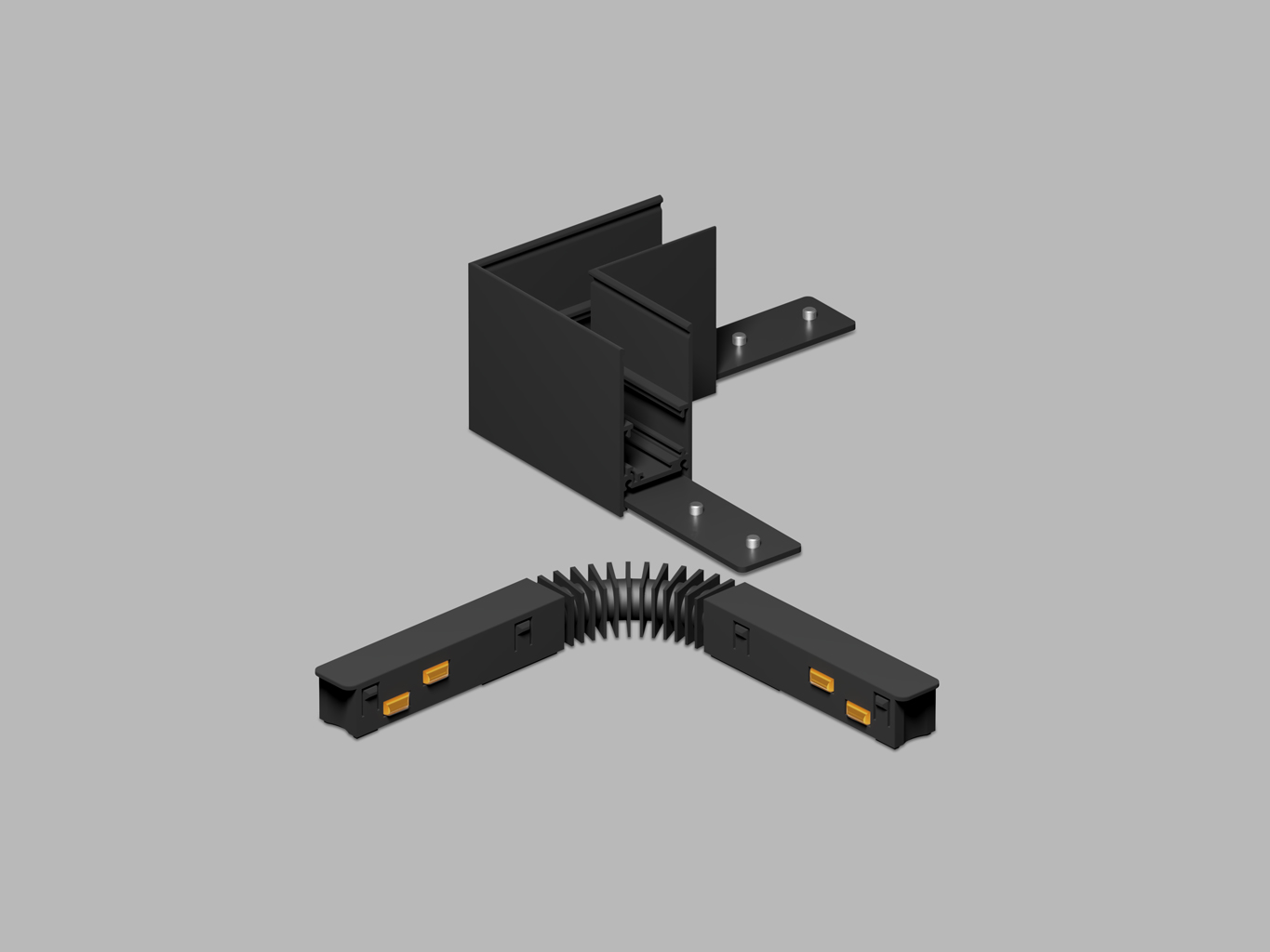 Rohová L spojka 90°, horizontální odbočení, stropního magnetického systému, materiál hliník, povrch černá/bílá, stmívání DALI, 48V, rozměry 68x53x68mm.