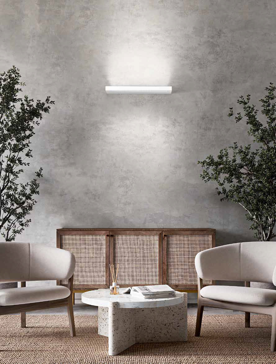 Nástěnné svítidlo, těleso hliník, povrch bílá mat, dif. plast opál, LED 16W/1280lm, 22W/1760lm, 28W/2240lm, teplá 3000K, Ra90, 230V, IP20, tř.1, rozměry dle typu, svítí nahoru/dolů.