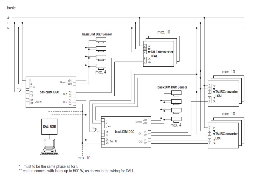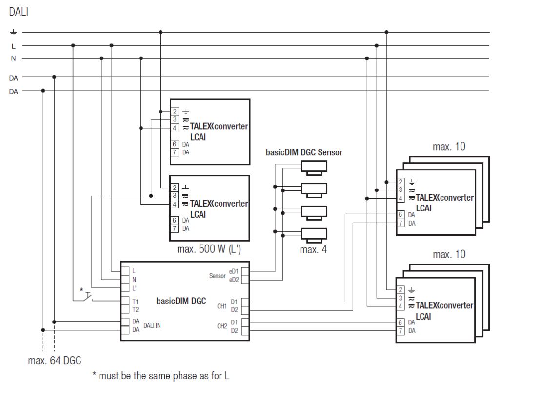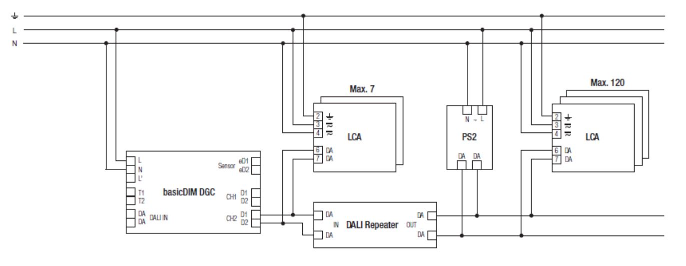 | Max 20 předřadníků DALI (10 na každý výstupní kanál) | |